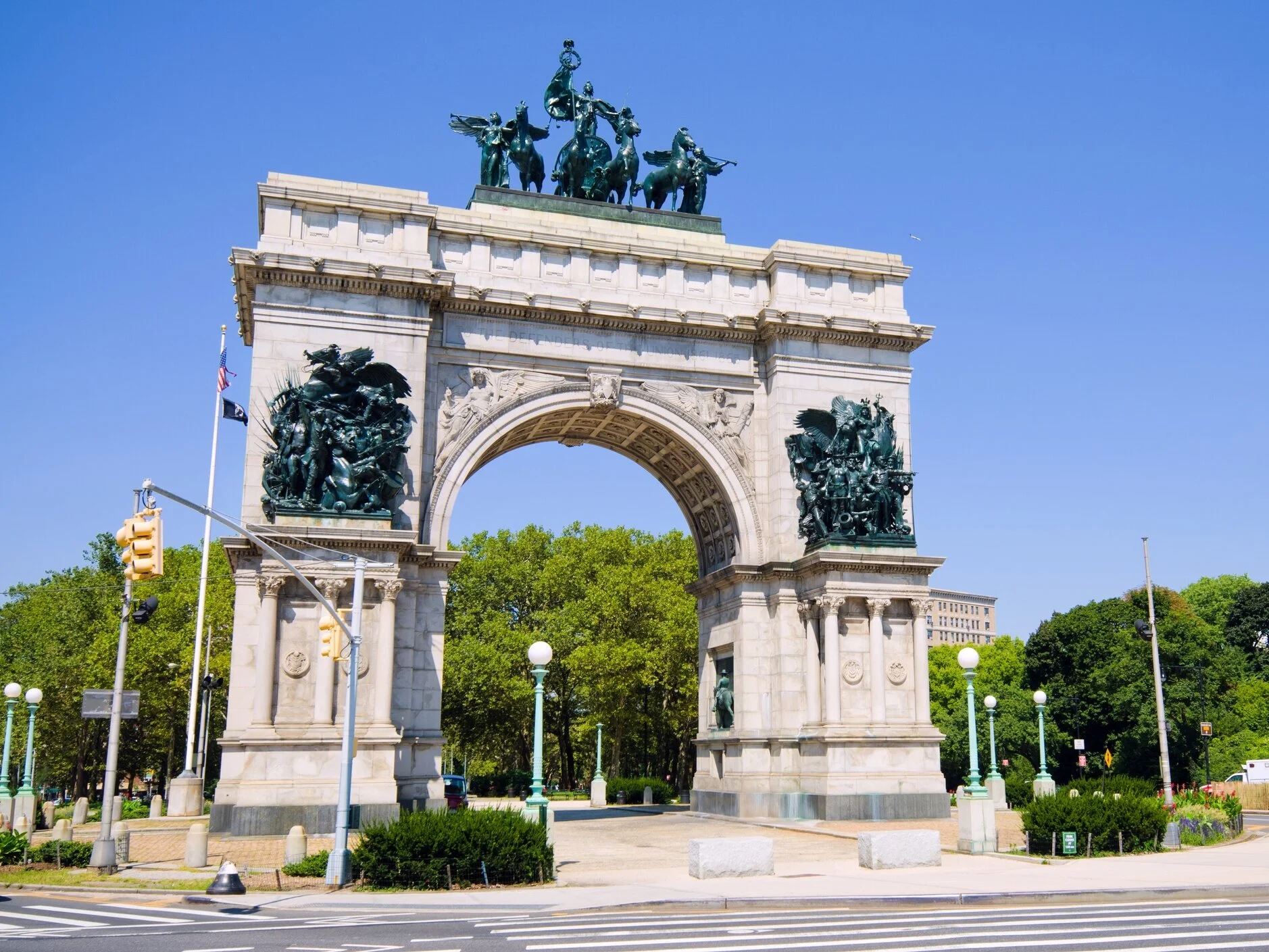 Grand Army Plaza, intended by the architects Frederick Law Olmsted and Calvert Vaux to be the main entrance to Prospect Park, is Brooklyn’s own Arc de Triomphe. Situated on a site of the first consequential battle of the American Revolution (the Battle of Brooklyn), there are several memorials, monuments, and statues inside. The most famous is the Soldiers’ and Sailors’ Arc (1892), which contrary to the grounds that it occupies, is a Civil War memorial, dedicated to the “Defenders of the Union”.