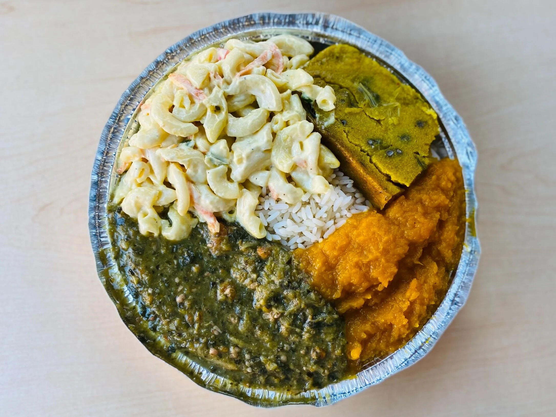 The Vegetarian Dinner allows you to choose four side dishes and turn them into a platter over rice. Pictured is Macaroni Salad, Callaloo, Pumpkin, and Coo Coo. Macaroni Salad and Coo Coo, which resembles polenta, are good for kids.