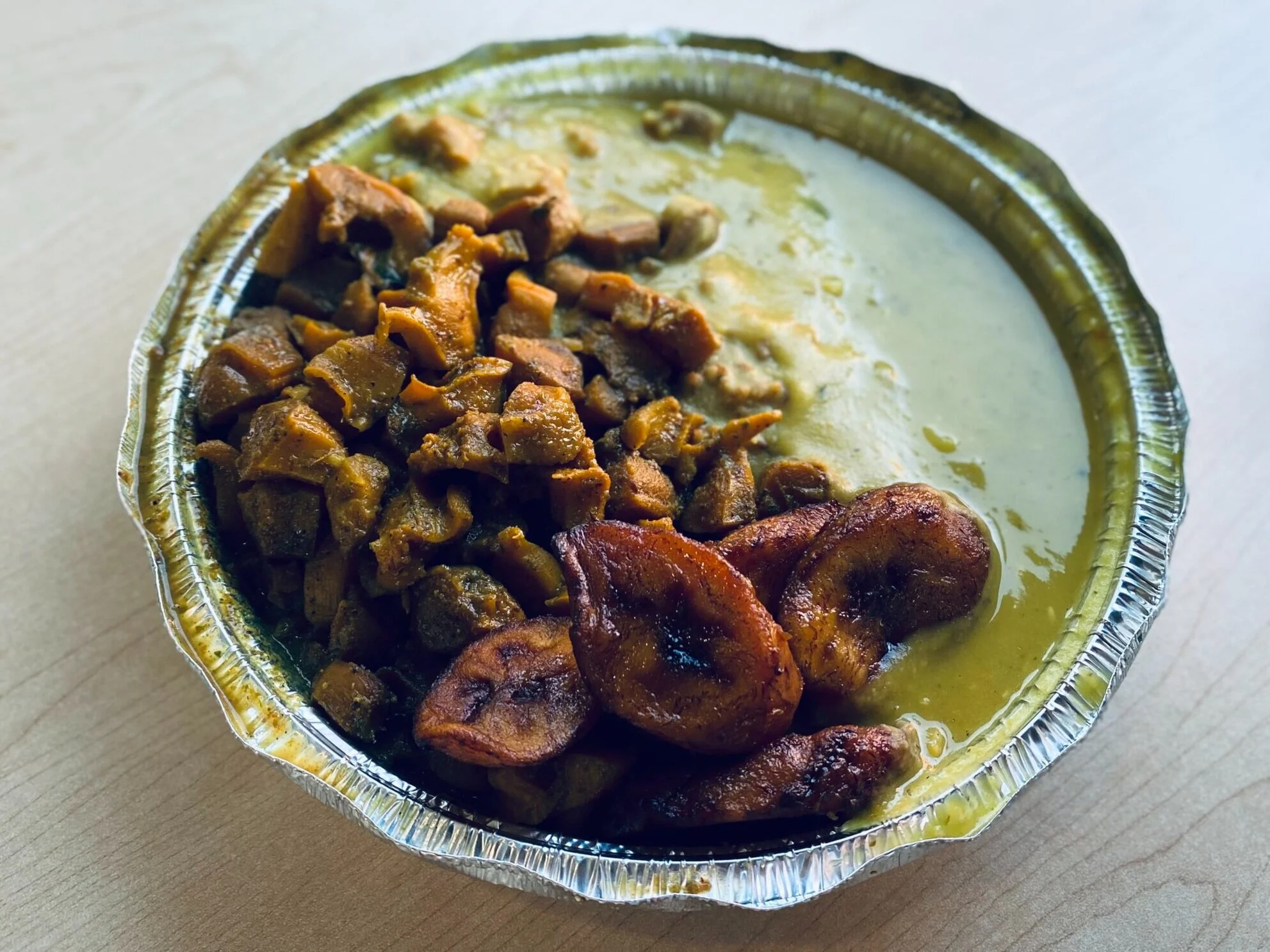 Our favorite order at Gloria’s is the Curry Conch, which oddly our kids like almost as much as we do. Curried conch is typical in the West Indies and it’s a much milder example than curried goat or beef. This time we ordered it with Dhal, a Trinidadian split pea soup, and Sweet Plantains.