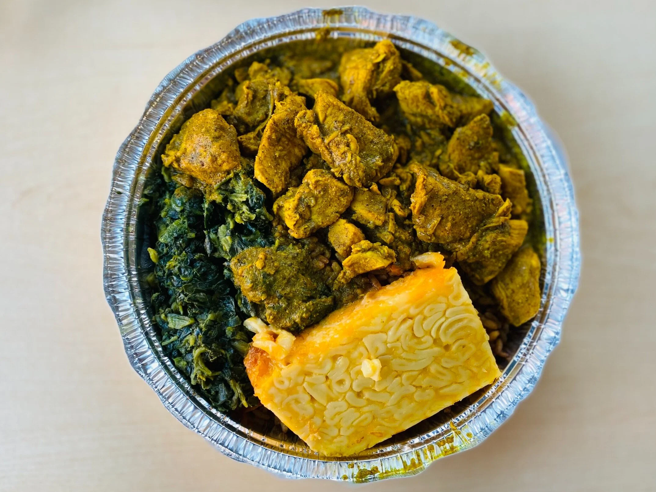 A Boneless Chicken Curry Dinner over peas and rice looks like this. All dinners come with two sides, and some of our favorites are Bhaggee, which remind us of collard greens, and Macaroni Pie, a big hit with our kids.
