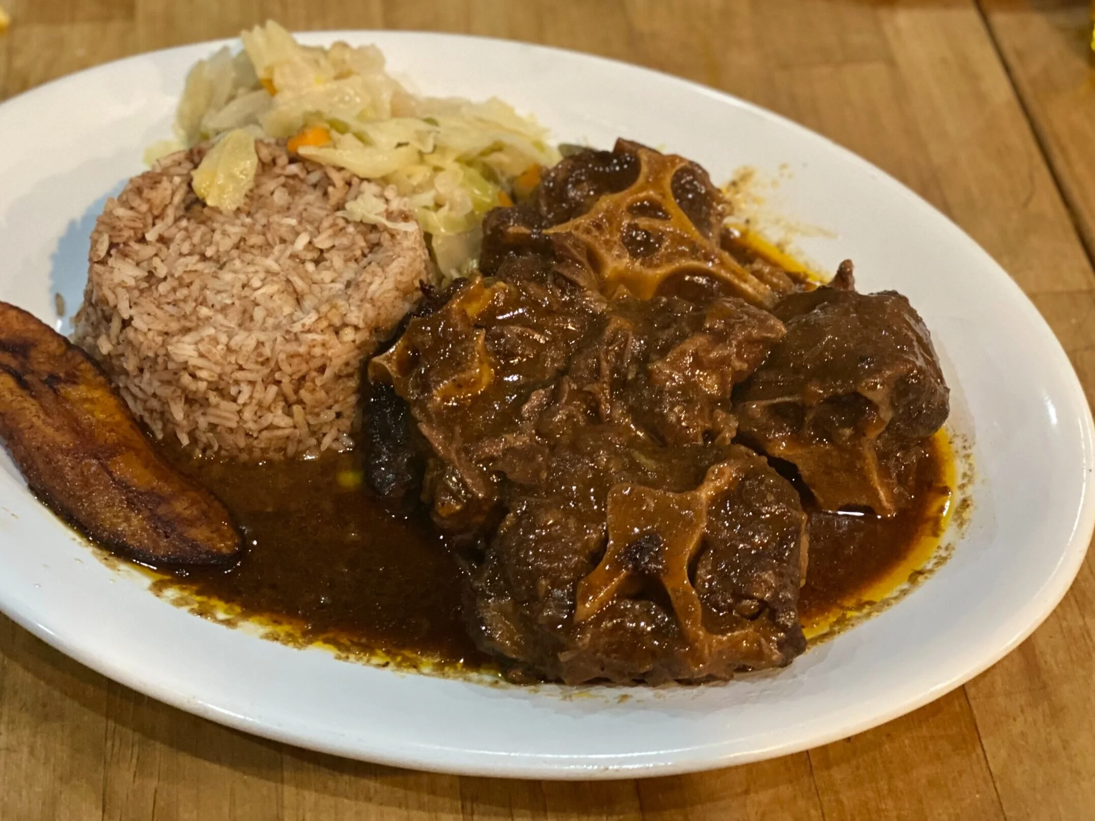 The Ox Tail with Rice and Peas is a traditional Jamaican dish. It’s fairly mild for a curry and our kids like it. The Jerk Chicken is also great but it’s actually spicier than the Ox Tail.