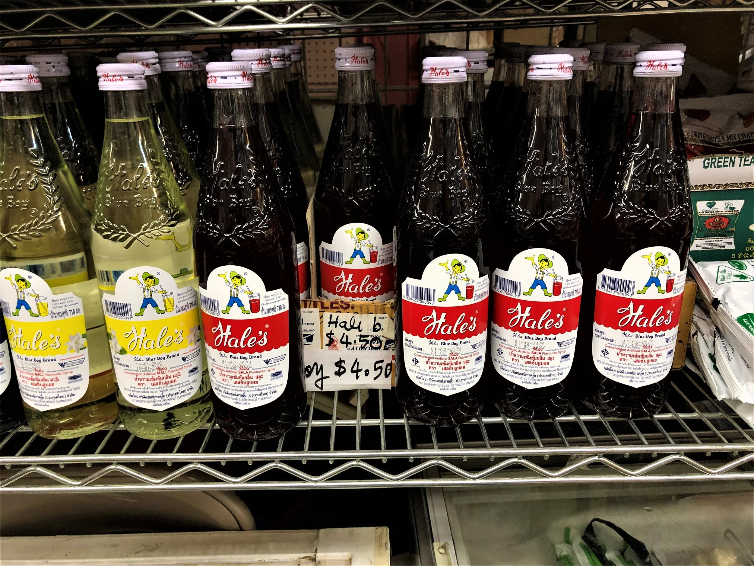 You’ll also find Hale’s Blue Boy, a famous Thai syrup manufacturer and the secret ingredient in Thai Pink Milk. Just mix the red flavor with milk and that’s the secret.
